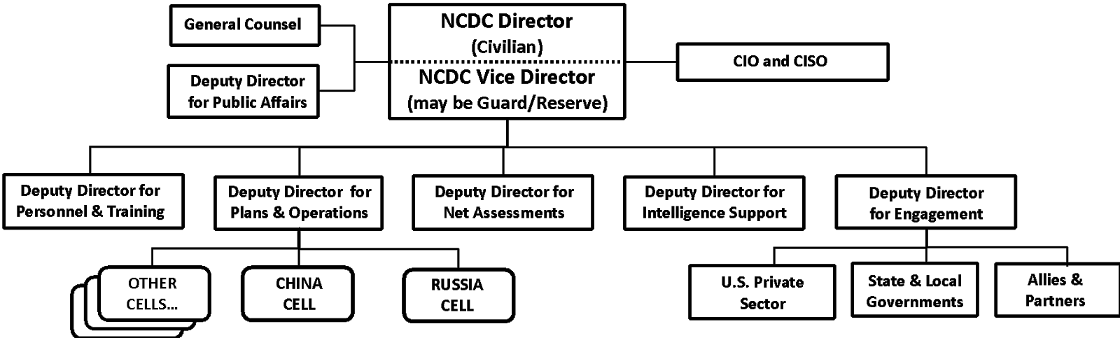 - The NCDC director should be a senior civilian with both senior-level U.S. government and private-sector experience, and the support of the national cyber director and the deputy national security advisor for cyber and emerging technology.
